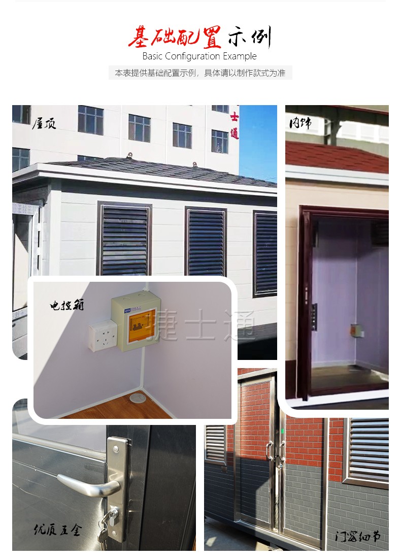 標(biāo)準(zhǔn)配置:墻體含保溫材料,屋頂鍍鋅板靜電噴涂,PVC吊頂,墻體顏色及門窗類型均可按需定制,地板可定做防滑鋁板/復(fù)合木地板,電箱、開關(guān)、插座、暗敷電線、照明燈、桌面、抽屜、鍵盤托、空調(diào)架等。