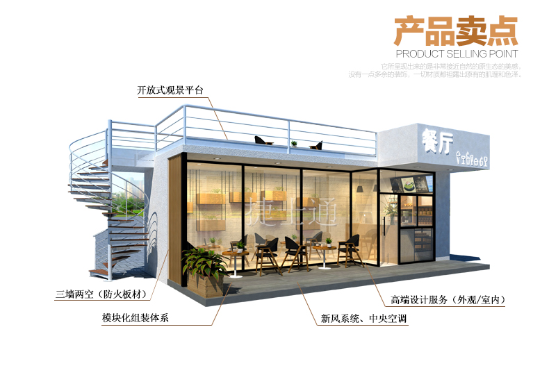 一個(gè)創(chuàng)新的商業(yè)空間載體不僅僅是捷士通移動(dòng)房屋一直進(jìn)取的方向,同樣也是諸多商業(yè)管理公司一直尋找的全新商業(yè)經(jīng)營(yíng)模式,美好移動(dòng)空間締造者捷士通移動(dòng)房屋,經(jīng)積累的多年行業(yè)經(jīng)驗(yàn),通過(guò)運(yùn)用裝配式房屋體系、鋼結(jié)構(gòu)為主體,搭配專利性墻體材料的形式,利用環(huán)保、便捷及美觀的設(shè)計(jì)理念,打造20-200平米輕奢移動(dòng)商業(yè)空間體—售貨屋及整條街售貨屋、售賣(mài)屋系列。咨詢熱線:158 2288 2616