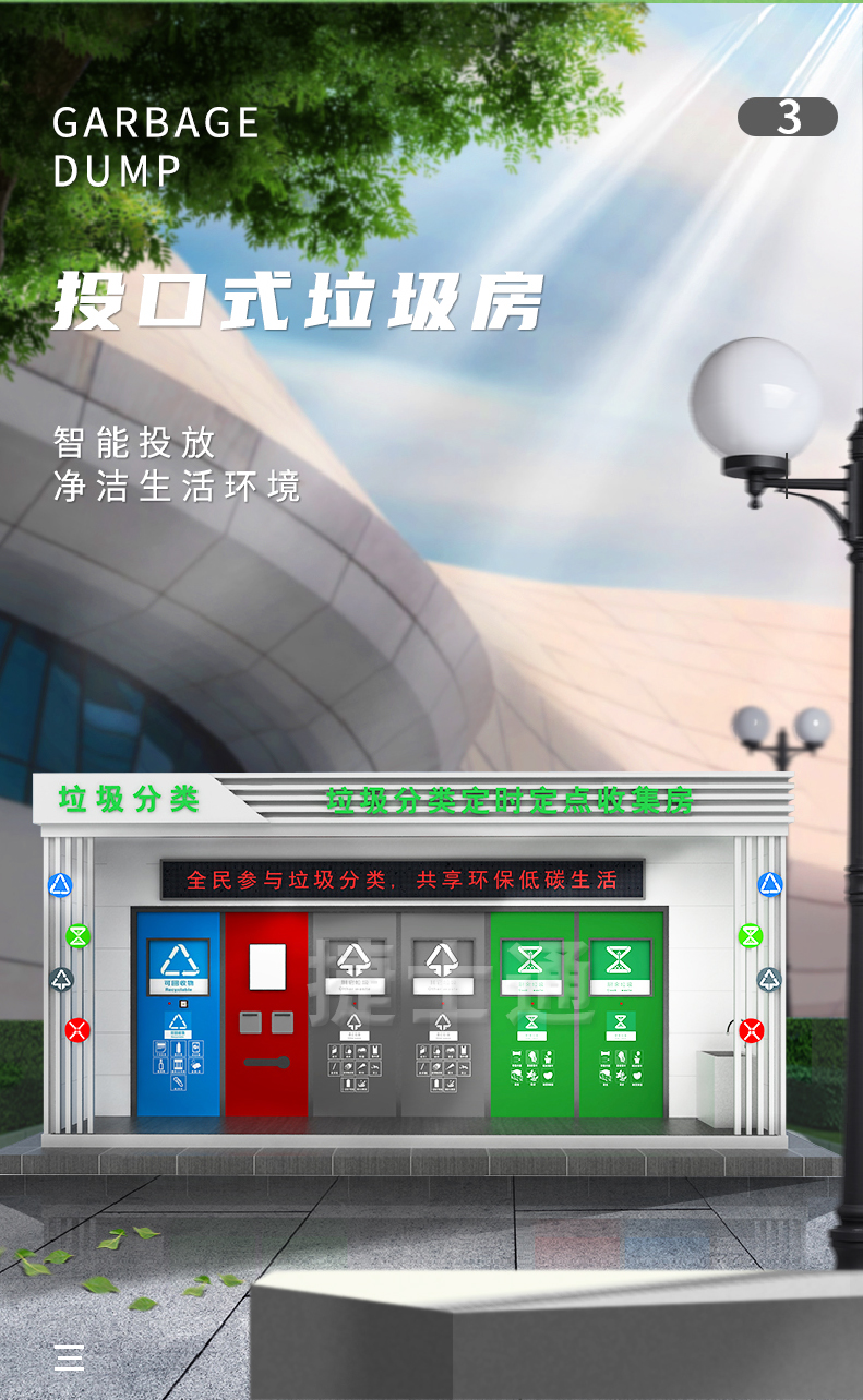 但這個是不全面的說法,因為捷士通的垃圾房在建設(shè)中設(shè)計到了美觀度,設(shè)計到了監(jiān)控系統(tǒng),設(shè)計到洗手池,沖水池,涉及到整體除臭技術(shù)以及整體祛去蒼蠅,去老鼠的功能,所以在老小區(qū),面積不大地方,是可以選用功能更全面的智能垃圾房,可以投放,積分,除臭,美觀一體化