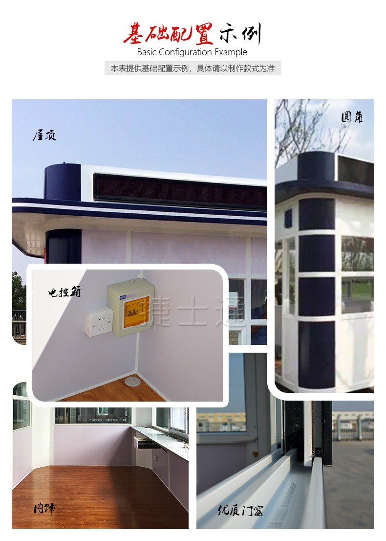 活動(dòng)窗:鋼質(zhì)型材,玻璃:5mm鋼化玻璃,內(nèi)頂:豪華PVC吊頂,外頂:采用鋼龍骨架支撐,鍍鋅鋼板壓力成型焊接,