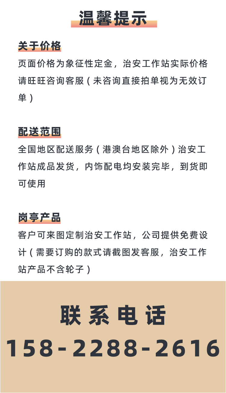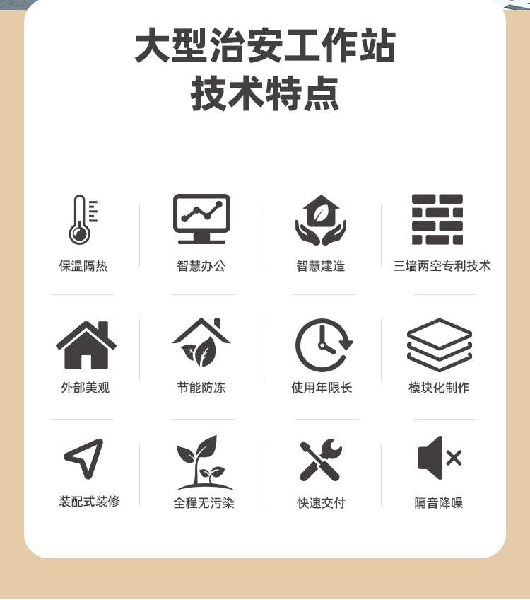 裝配式警務工作站是融合社會化、智能化、法治化、經驗豐富化的社會治理模式,實現24小時的便捷式工作模式,相當于便民店的模式,警民一家親在這里隨時上演。有效提升了人口密集區(qū)域社會治安駕馭能力和創(chuàng)新服務群眾能力。一是基于街面治安防控力量投放效能考慮,針對街面治安有限的警力一定程度制約了街面治安防控效能,提高警力投放和勤務運行效能,并積極拓展群防群治力量是 這一困局的較 佳途徑。二是基于街面防控快速反應的現實需求考慮。圍繞“較 近警力響應、較 短距離處置”的目標,構建“一鍵響應”的情指行合成作戰(zhàn)全產業(yè)鏈生態(tài)體系,以大數據牽引優(yōu)化警力流,有效解決了指令不暢、多頭指揮、信息不對稱等問題,三是基于人民群眾對政府服務升級的新期盼考慮。新時期,人民群眾對社會治理的需求不再局限于打擊違法犯罪這些基本的安全保障,日趨傾向于更高層次的政府便民服務。為此,聯勤警務站實行“24小時不打烊”,開設街面便民服務一站式窗口,推出以“善警辦理”為主要內容的“較 多跑一次”服務,實現了群眾到政府辦事“就近跑”