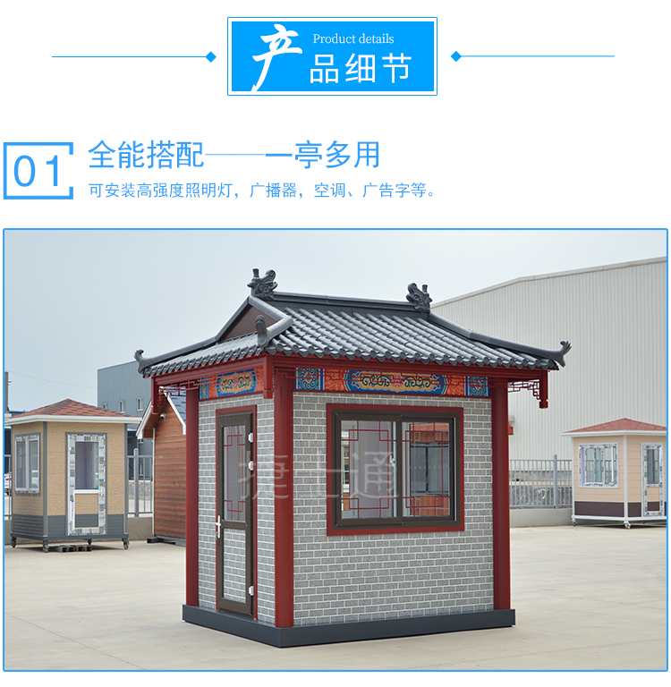 特有的造型,仿古的花紋,創(chuàng)意的窗飾,與古建筑恰到好處的融合,仿古的景區(qū)、仿古的公園、仿古的景點,保安崗?fù)?、售票亭、休息亭均可采用此類風(fēng)格,而且在設(shè)計的時候,尺寸均可定制?。。?!運輸怎么解決?捷士通廠家和全國的物流均有合作,所以只要您在中國,均可運輸?shù)剑。?br />